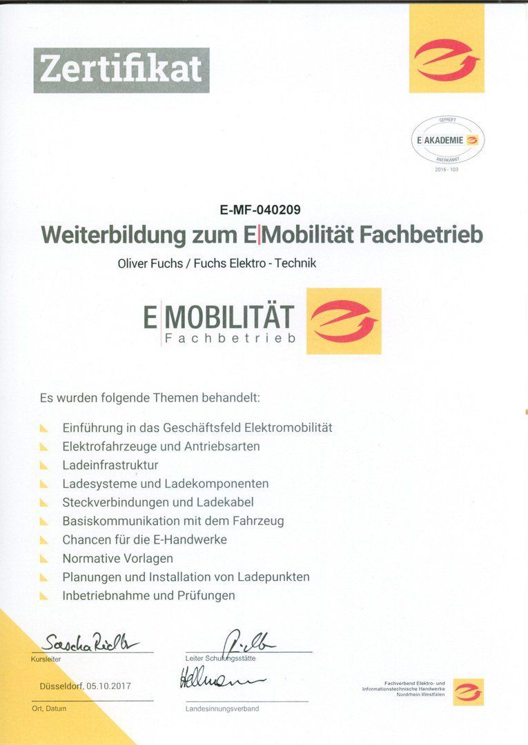 Der Elektrohandwerksbetrieb von Dipl.-Ing. Oliver Fuchs wurde am 15.03.2011 von der Innung, dem Landesinnungsverband sowie dem Zentralverband der Deutschen Elektro- und Informationstechnischen Handwerke (ZVEH) unter der Nummer NRW-251-5640 als E-Markenbetrieb aufgenommen und gewährleistet damit höchste Handlungsmaximen des Elektrohandwerks. Von der Qualitätssicherung über Markenführung bis hin zu einem aussagekräftigen und für das Unternehmen bindenden Unternehmensleitbild wurde im Sinne des Kunden vertraglich festgehalten, was die tägliche Arbeit eines beispielhaften Elektrobetriebes ausmacht.